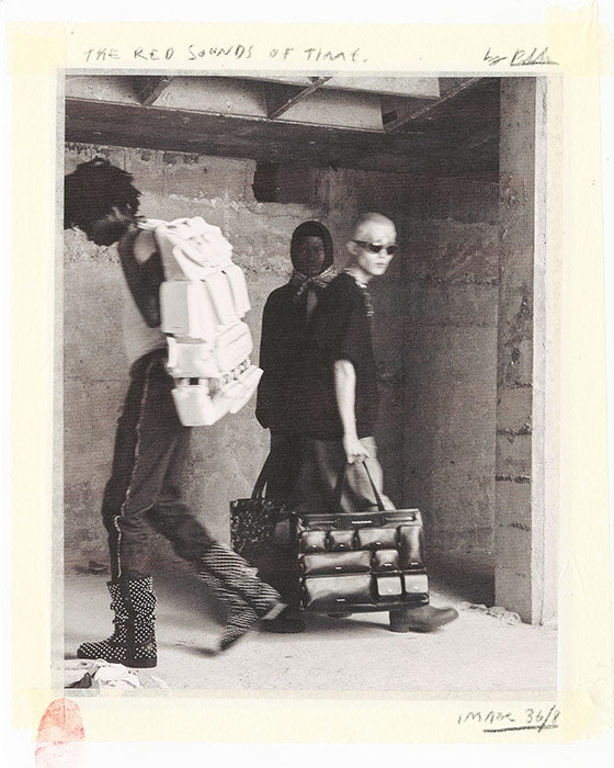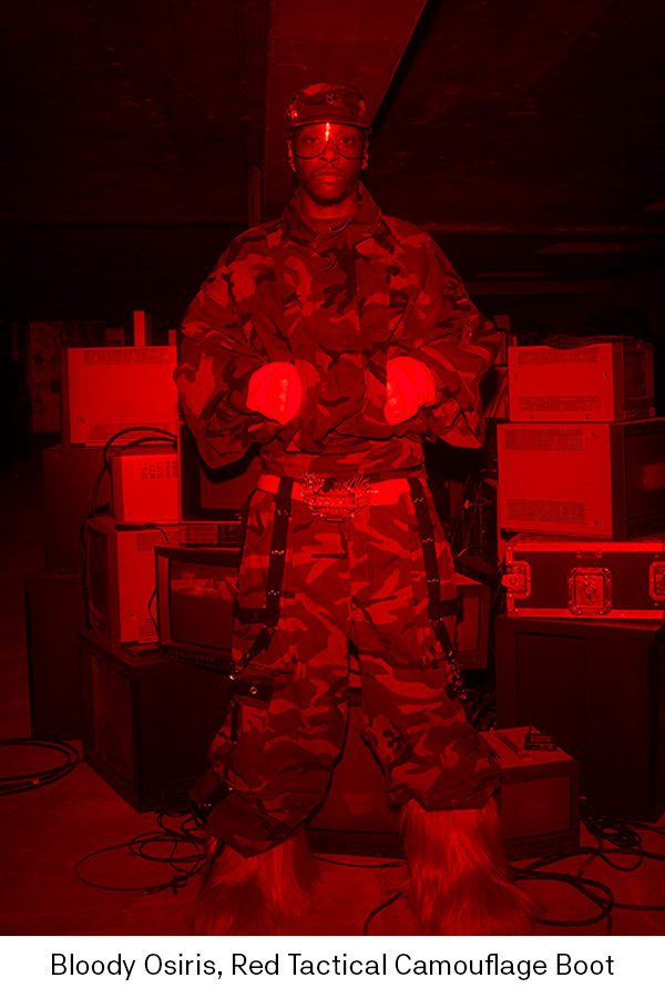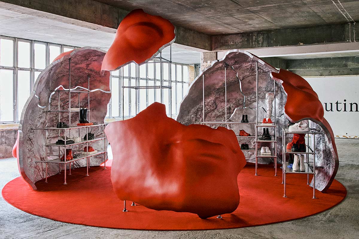 A photo installation presents Jaden Smith’s pieces, some of which are captured using early photographic methods: each of these images is created under a cloth and developed by hand, with silver and chemical solutions revealing the forms. The journey culminates in a monumental exploded red head that dominates the space, serving as an immersive display to reveal the final chapter of the collection.