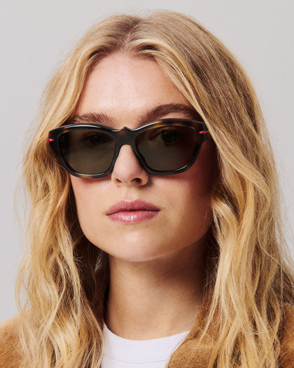 Bringing the Maison's signature flair to life, the Miss Z, So Kate, Kate, Hot Chick, Greggo, Roller, and Our Georges lines each showcase distinct character. Miss Z’s architectural frames and palmette detailing exude Art Deco glamour, while So Kate’s red-sole-inspired silhouette adds elegant curves. The frame of the Kate sunglasses elegantly mirrors the shape of the signature red sole of the eponymous pumps, while the Hot Chick model features a sensual curve inspired by the iconic V-shaped notches of the stiletto of the same name. Greggo channels chic minimalism with polished black acetate, echoing classic Oxford shoes' leather, while the ornamental spikes of the Roller are inspired by the aesthetic codes of the Maison's men's collection. Lastly, Our Georges dazzles with avant-garde gold accents, signature studs, and subtle red touches—a nod to Christian Louboutin’s iconic style.