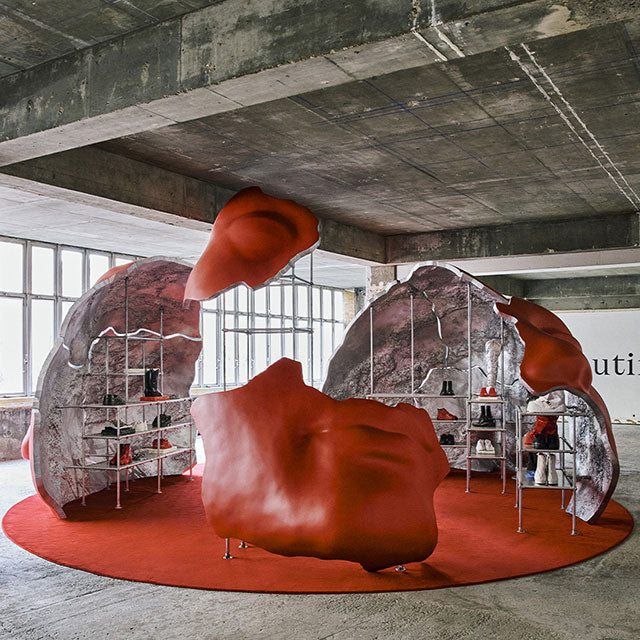 A photo installation presents Jaden Smith’s pieces, some of which are captured using early photographic methods: each of these images is created under a cloth and developed by hand, with silver and chemical solutions revealing the forms. The journey culminates in a monumental exploded red head that dominates the space, serving as an immersive display to reveal the final chapter of the collection.