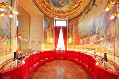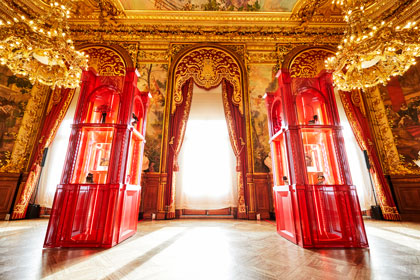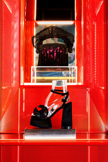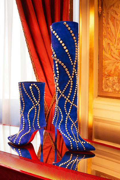 After the show, Christian Louboutin unveiled the Fall/Winter 2023 collection within the grand historical ballroom of the Opéra Comique. The collection displayed on two metallic red towers and two circular alcôves paid tribute to the design of the iconic building.